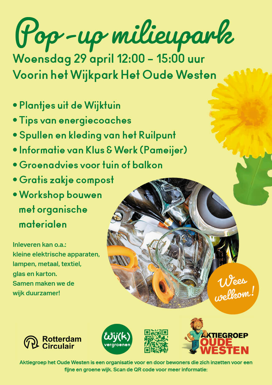 Op woensdag 29 april is er weer een pop-up milieupark in het Wijkpark. Je kunt er verfresten, chemische materialen, batterijen, papier, plastic, olie, kleine electrische apparaten .. kortom alles wat niet in de vuilnisbak mag, langs brengen. Het moet wel in een boodschappentas passen!